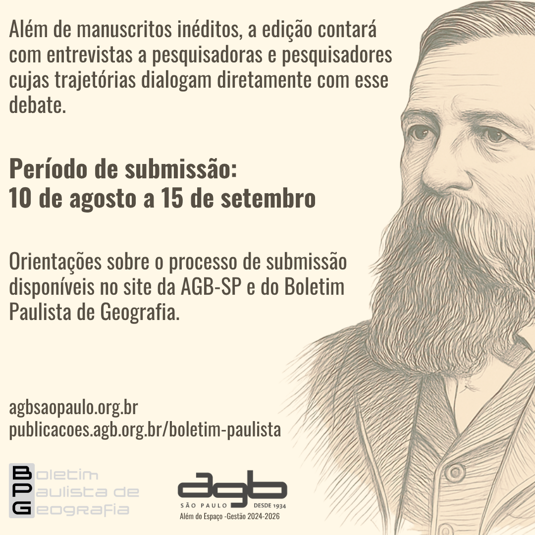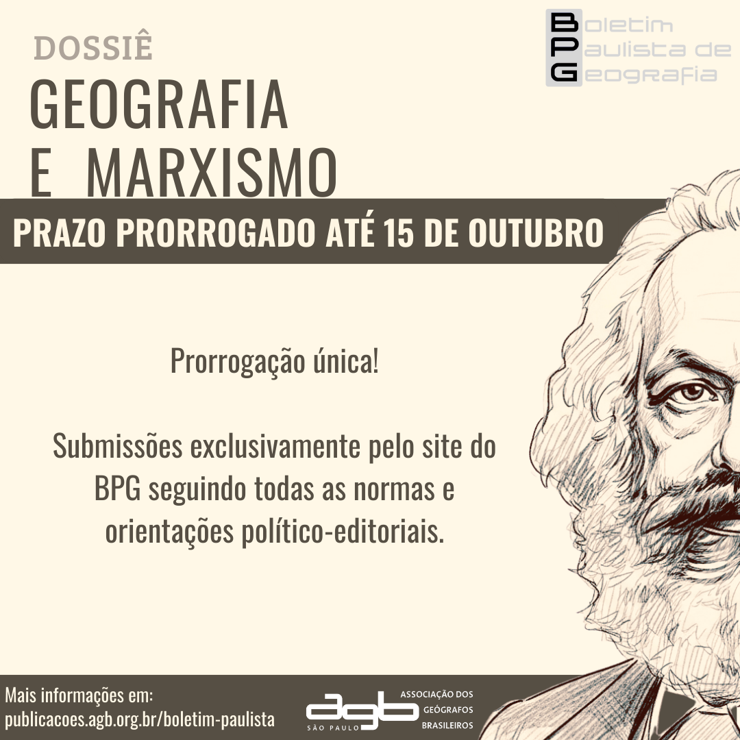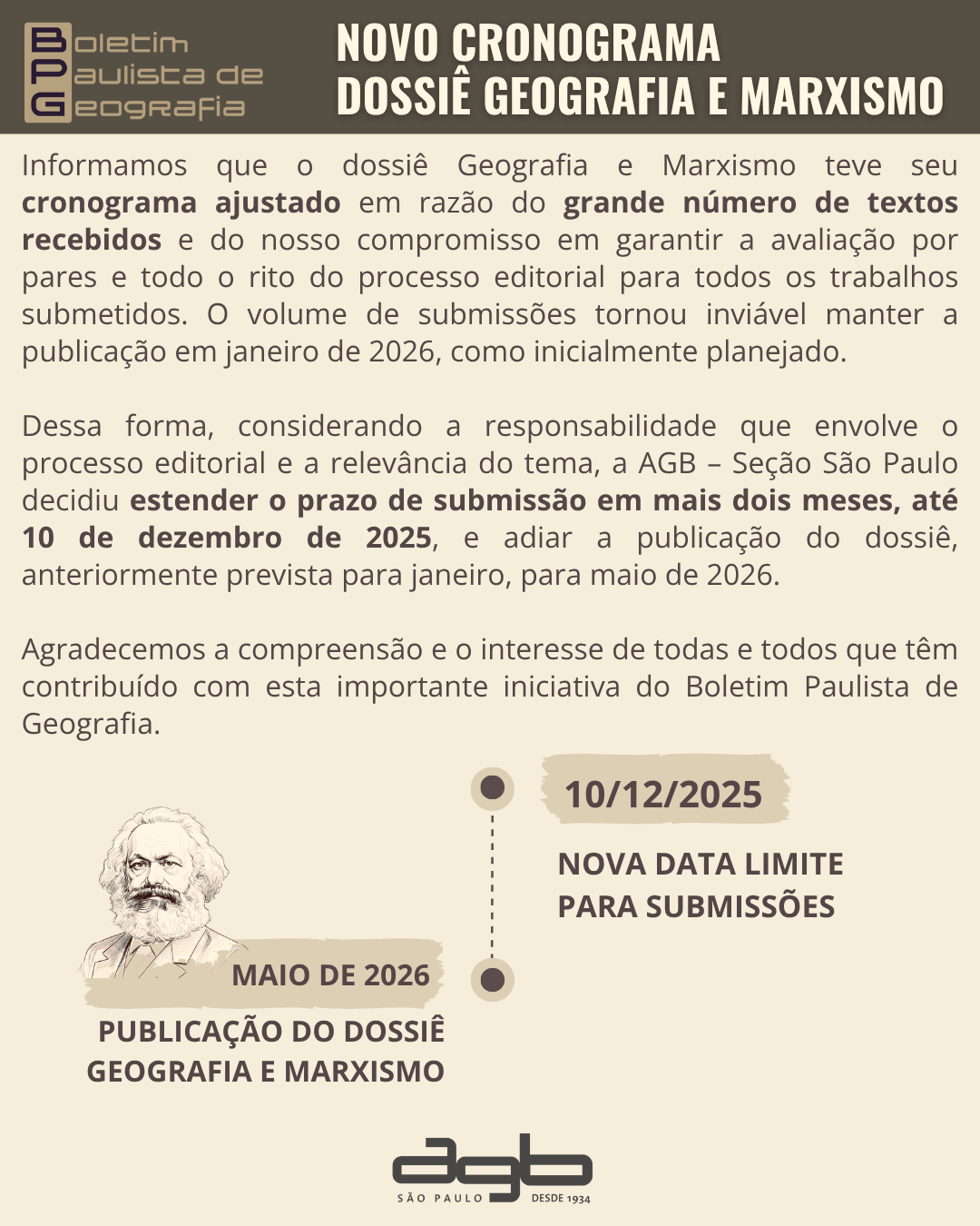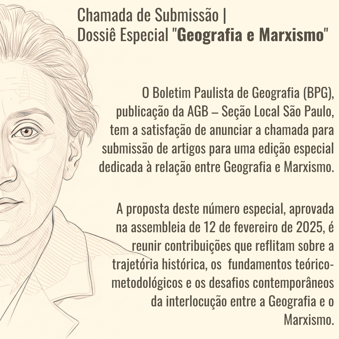 Relembramos que o Boletim Paulista de Geografia receberá contribuições para o dossiê Geografia e Marxismo até o dia 10 de dezembro de 2025!
