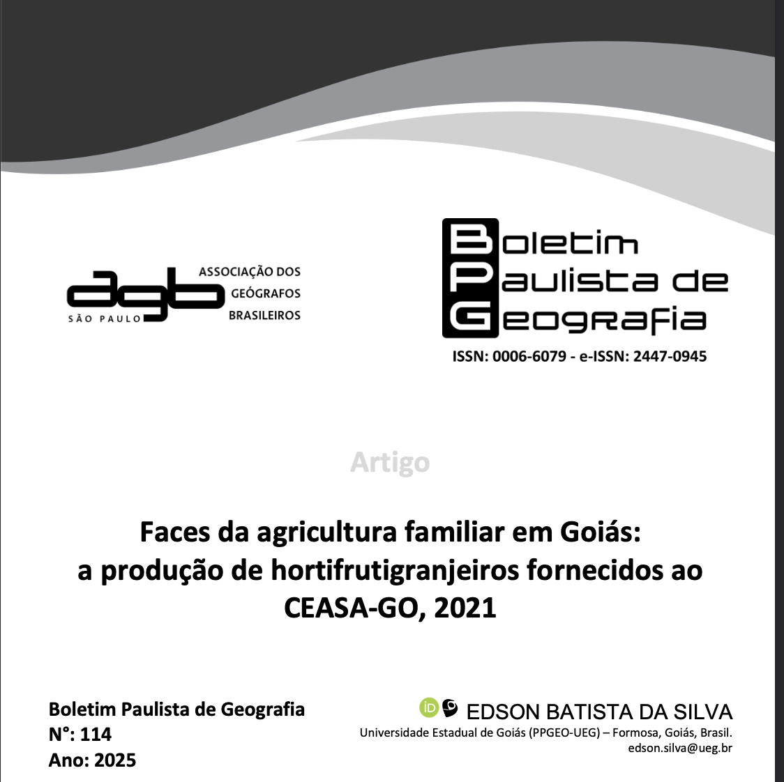 Silva, E. B. da. (2025). Faces da agricultura familiar em Goiás: a produção de hortifrutigranjeiros fornecidos ao CEASA-GO, 2021. Boletim Paulista De Geografia, 1(114), 29–54. https://doi.org/10.61636/bpg.v1i114.3223